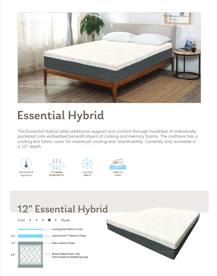 Proudly made in the U.S.A. at one of MLILY's three factories, The Essential line is an economical choice as well as an exceptionally comfortable one. The collection includes four mattresses that borrow advanced technology from our other Lines and Series. The first three utilize an All Foam design that is a bit more adaptive, while the Hybrid option has individually pocketed springs that allow it to be a bit more supportive. All of these mattresses include a layer of AeroFusion™ Memory Foam that enhances temperature regulation and breathability.