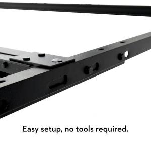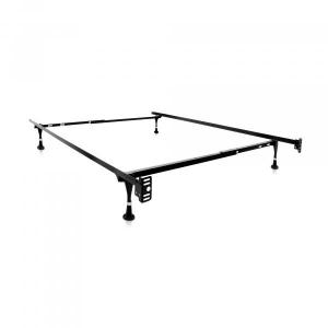 FITS ANY BED SIZE The Universal Bed Frame is highly adjustable and provides enhanced frame support for Twin, Twin XL, Full, Full XL, Queen, King, and California King bed sizes. DIMENSIONS Option Dimensions Height Wheels 70 x 38-53 in 7.5-8 in Glides 70 x 38-53 in 7.5-8 in MATERIALS Tri-Support System Patented bed frame design provides added support to the cross rails for exceptional strength and durability.