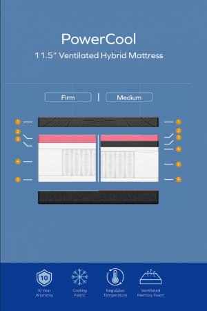 While originally conceived as part of the PowerCool Sleep System, the fully ventilated PowerCool mattress shines even solo. Its clever construction enables passive airflow to effortlessly whisk away heat, keeping you cool and comfortable all night long. Try it with the PowerCool Base for additional cooling and air circulation.