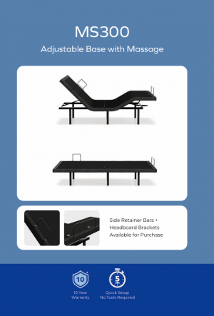 The MS300 Adjustable Base comes with a wireless remote featuring a convenient built-in flashlight, allowing you to customize your head and foot positions independently or indulge in relaxation with 3 massage modes at your fingertips. Immerse yourself in the ease of USB charging ports and LED lighting, and enjoy the seamless synchronization of multiple bases for split sizes